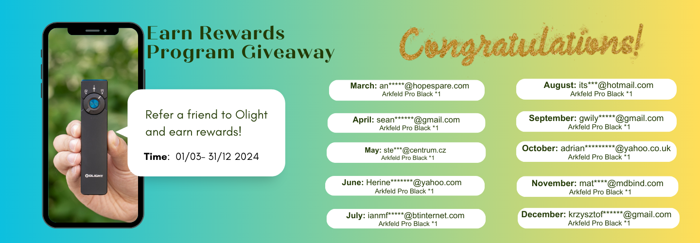 The Olight Earn Rewards Program offers an opportunity for our members to earn rewards by inviting their friends or families to join the Earn Rewards Program or make a purchase at the Olight official store. Earn rewards for you and your friends by recommending Olight.