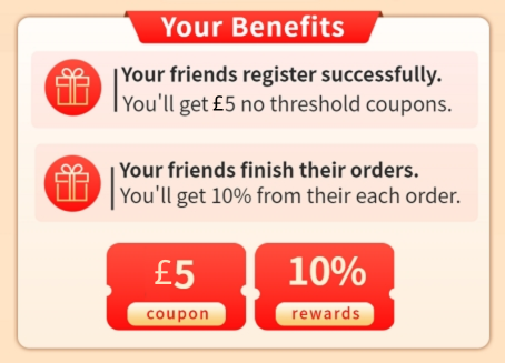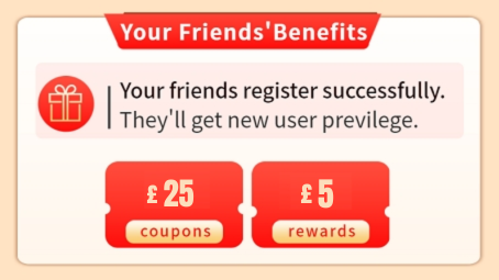 Inviter and invitees both get rewards for successful sign-ups. When they complete registration, you will receive £5 (no threshold) in your account and invitees get new user privileges & £5 rewards.